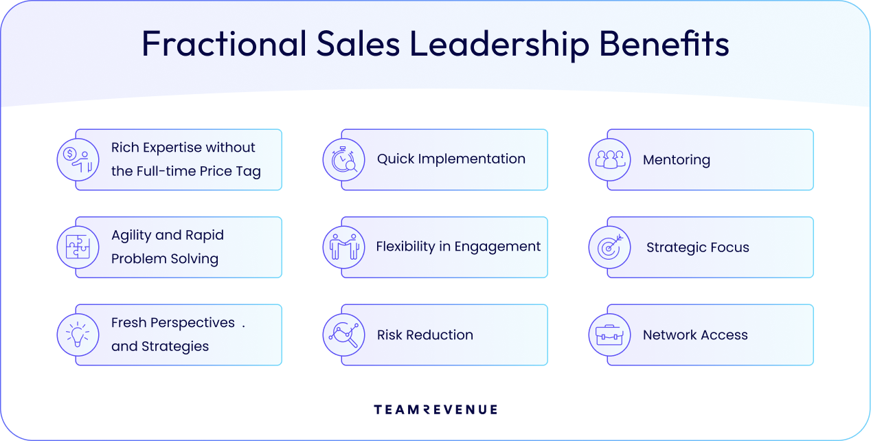 Many fractional leaders bring a vast network of industry contacts, potential leads, and partnerships, and some may even bring their own mini network of sales enablement resources.